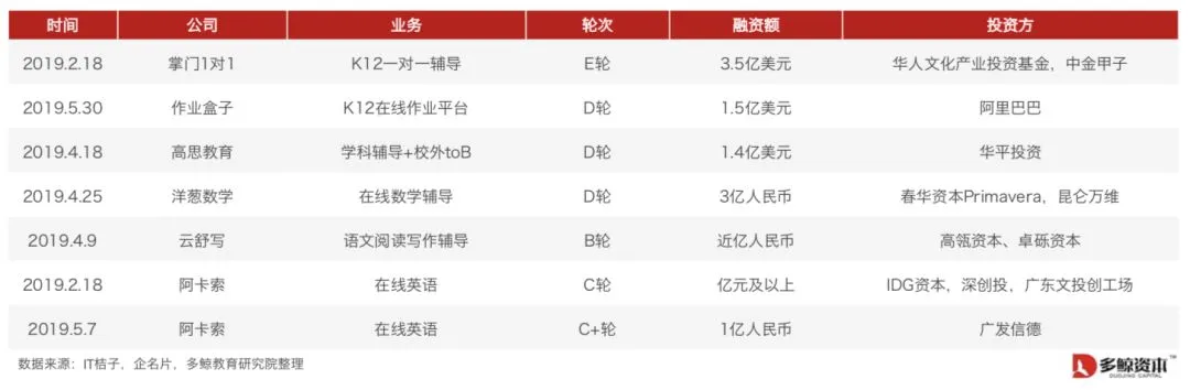2019年上半年K12赛道投融资时间达29起,金额53.2亿元,轮次以A轮为主,其中融资额最高的为掌门 一对一,达3.5亿美元,其次为作业盒子的1.5亿美元D轮融资,巨大融资额背后是市场竞争白热化。