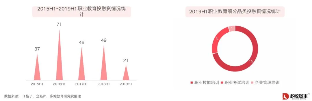 1)职业教育赛道投融资数量不及预期,同比下降57%,不及18年上半年半数。根据市场公开数据,2019年上半年职业教育一级市场共发生21起融资事件,占上半年总数的13%。其中各类技能培训项目15个,占比71%,符合新职业教育和蓝领培训发展的大趋势。上半年职教看似热度很高,但实际投融资案例并不突出,甚至远低于18年同期阶段,原因在于风险投资市场整体偏冷,很多基金由于投资回报不及预期、新基金募资变难,导致出手率明显下降,机构更希望投有确定性收益的项目。我们预计19年下半年仍然会持续上半年市场不景气状态。