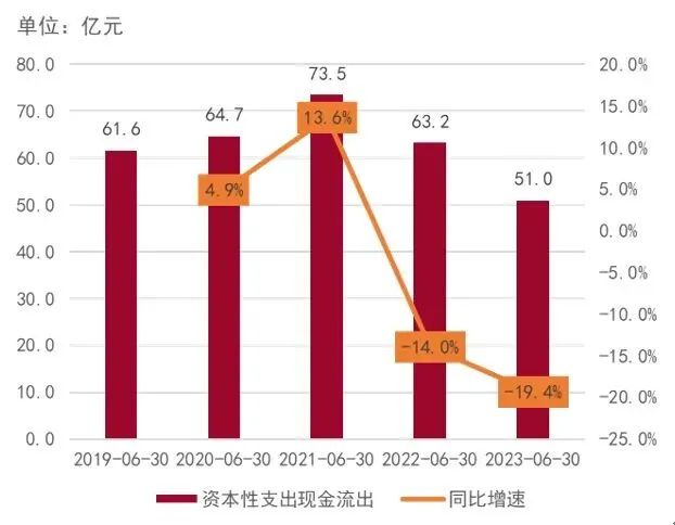 图4:2019-2023年上半年A股上市旅游企业资本性支出现金流出