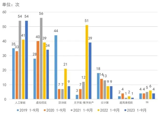 2023年前三季度数字文化产业重点赛道投融资事件数量占同期文化产业投融资事件总数的31.4%,较去年同期上升4.8个百分点。由于文化与科技的融合仍在探索阶段,文化产业投融资长期主线还需进一步形成。2019-2023年,数字文化产业热门赛道轮动较快,近三年数字文化产业投资项目数量最多赛道均不相同。