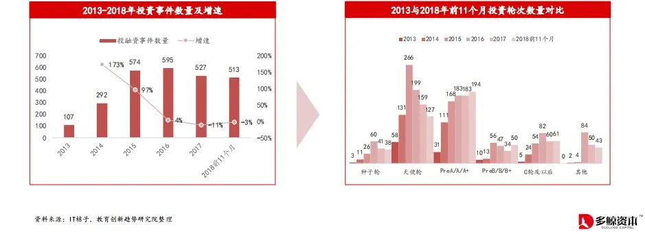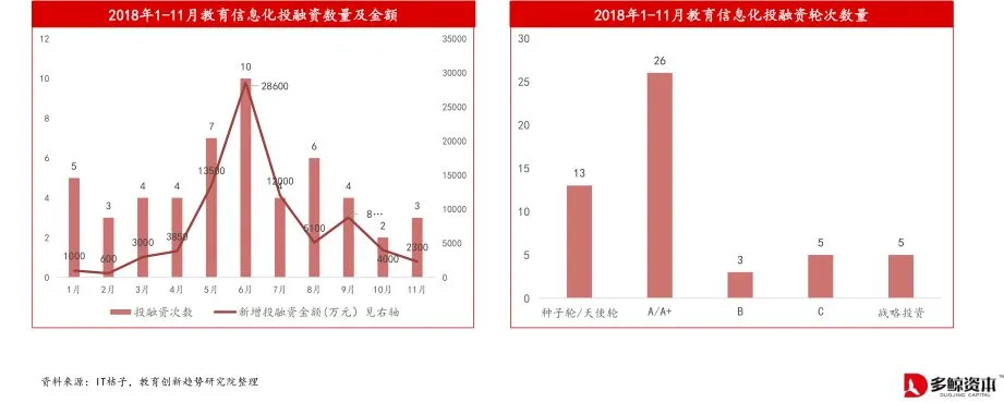 (2)单看2017与2018年前11个月,2018年前11个月投融资数量同比下降约3%;从轮次分布来看,从种子轮到A轮,数量是持续上升的,说明新进入教育行业创业者持续增加,C轮及以后投资数量相对平稳,反映整个市场多数赛道并未成熟。
