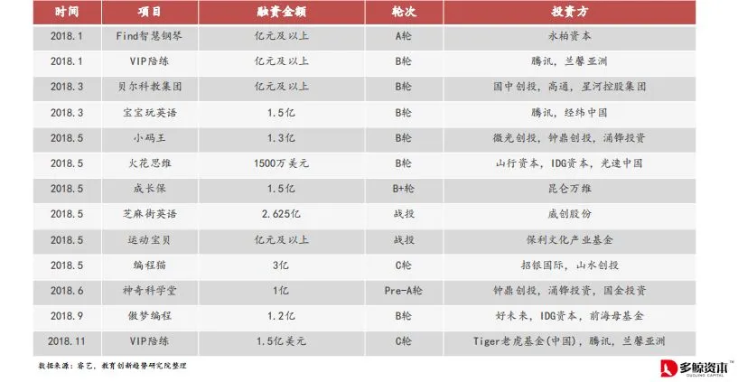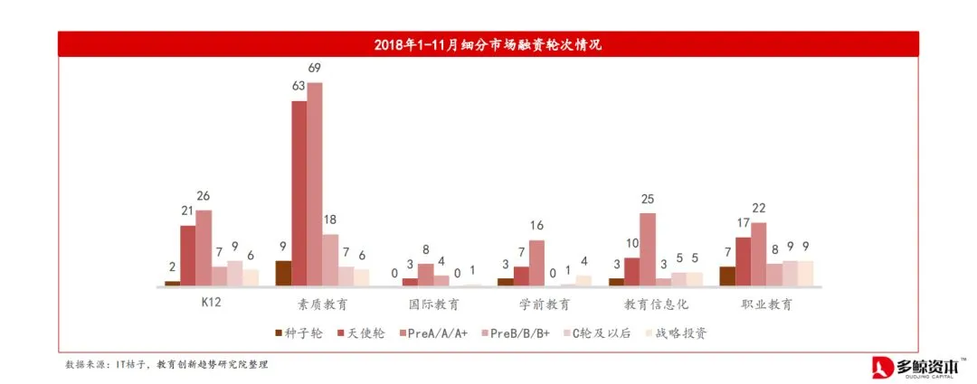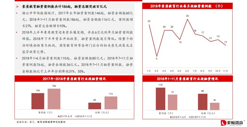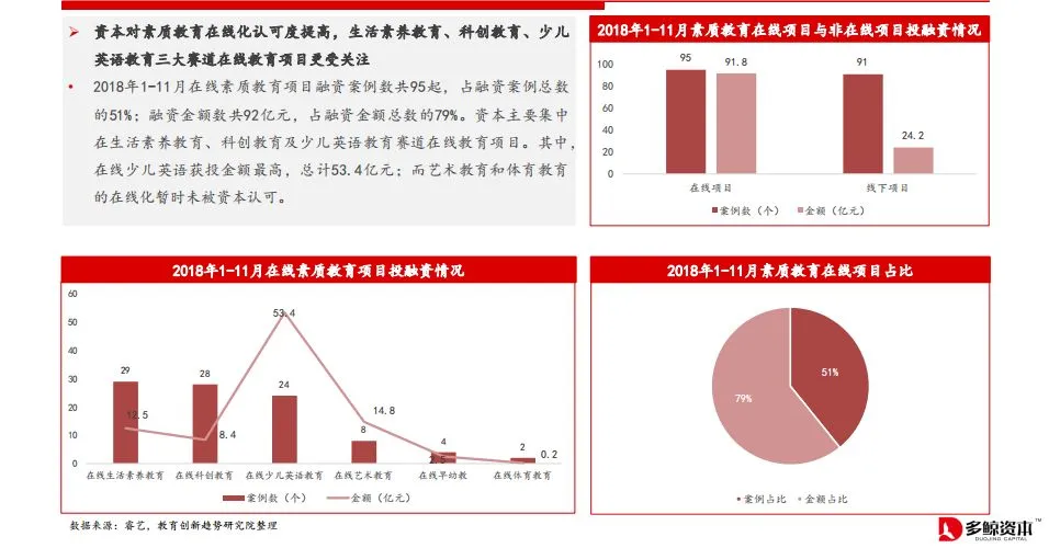 (2)自2017年下半年以来,素质教育赛道投融资激增,2018年前11个月素质教育赛道融资数量达到174个,占比40%。