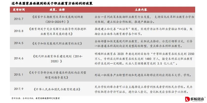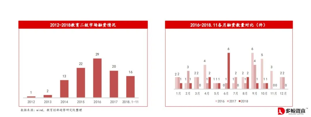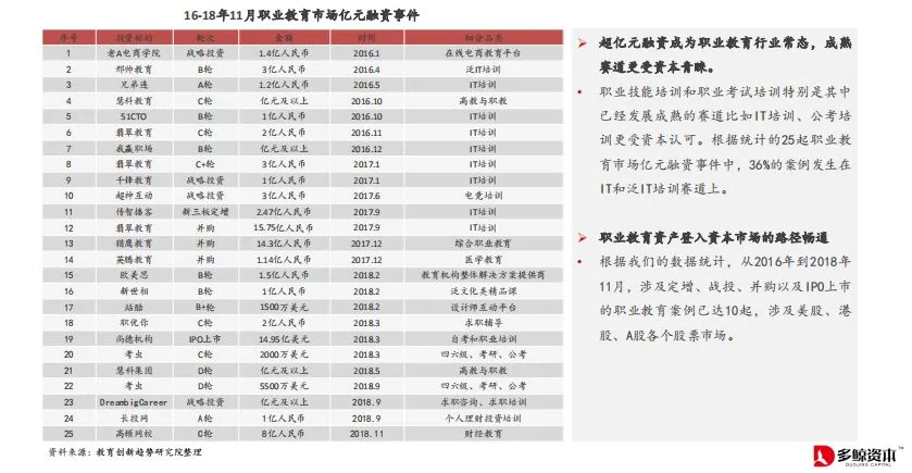 • 根据我们的数据统计,从2016年到2018年11月,涉及定增、战投、并购以及IPO上市的职业教育案例已达10起,涉及美股、港股、A股各个股票市场。