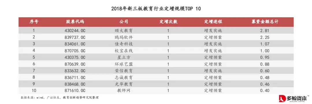 (1)2018年以来,教育行业新三板共有30家企业开展了31次定增募资,累计拟募集资金约14.76亿,与去年同期相比下降16.85%。其中定增预案共16项,累计拟募集资金为7.31亿;已完成增发实施15次,累计实际募集资金7.45亿。