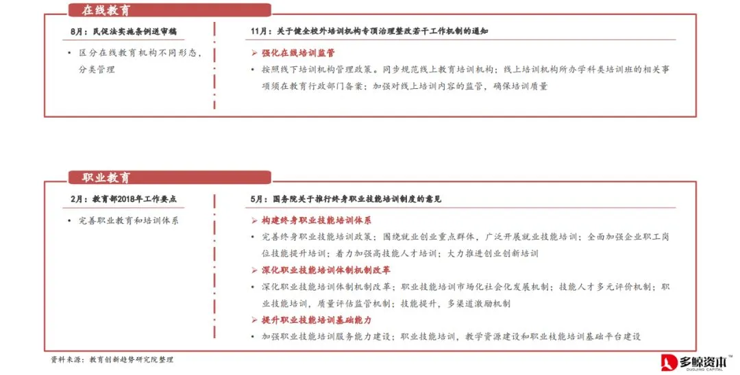 (3)11月新华社授权教育部等北京市教委颁发《中共中央国务院关于学前教育深化改革规范发展的若干意见》,《关于健全校外培训机构专顶治理整改若干工作机制的通知》,《北京市营利性民办学校监督管理办法》及《北京市民办学校分类登记办法》。