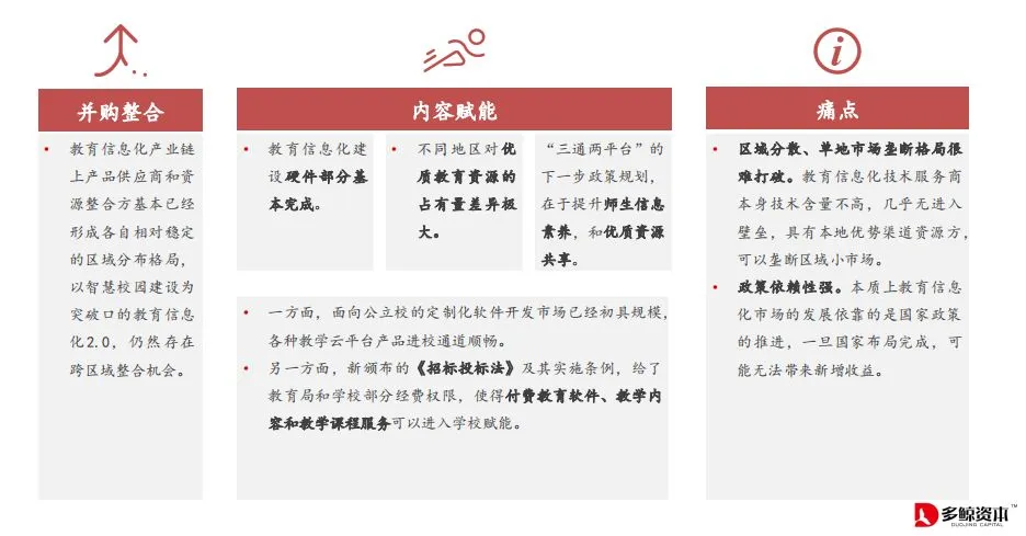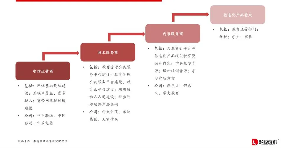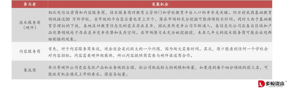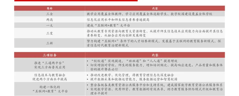 • 教育信息化:进入2.0时代,从硬件载体到软件内容,服务属性增强,参与日常教学和管理流程的产品、服务迎来机会