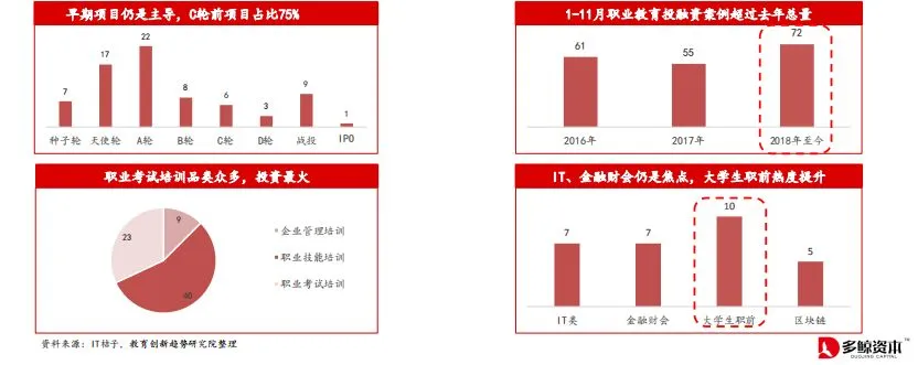 • 职业技能培训和职业考试培训特别是其中已经发展成熟的赛道比如IT培训、公考培训更受资本认可。根据统计的25起职业教育市场亿元融资事件中,36%的案例发生在IT和泛IT培训赛道上。