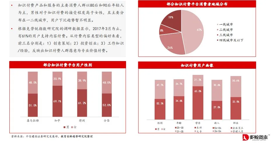 • 知识付费产品和服务的主要消费人群以80后和90后年轻人为主,男性对于知识付费的接受程度高于女性,且主要分布在一二线城市,用户下沉趋势暂不明显。