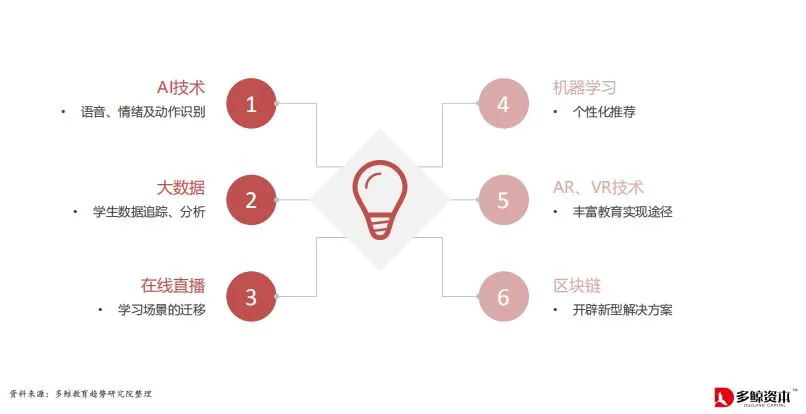 • 直播及双师广泛被采用,AI及大数据应用正不断铺开,市场正在探索区块链等新技术在教育中的实践效果。