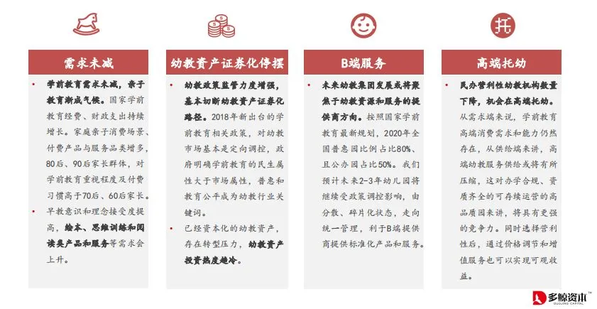 • 需求未减,看好早教亲子、高端托幼、思维启蒙、幼儿园B端;