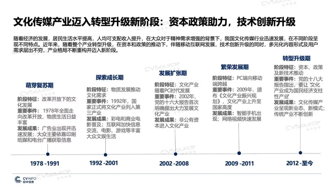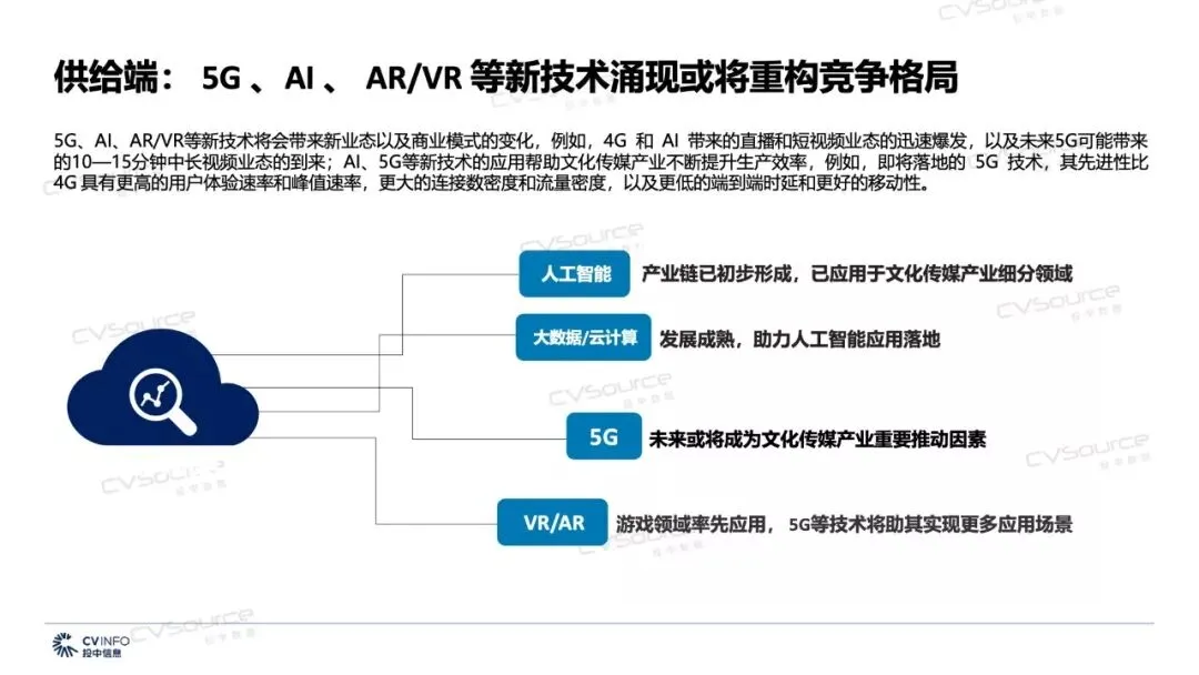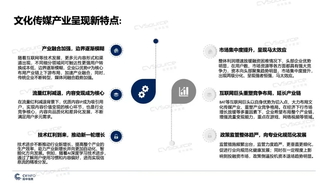 近日,投中研究院最新发布《2019年文化传媒产业投融资报告》,报告指出,在资本遇冷,监管趋严,市场回归理性,5G、AI等新技术不断涌现背景下,2019年文化传媒产业将会迎来的机遇和挑战。文化传媒产业也呈现新特点:产业融合加强,边界逐渐模糊;流量红利减退,内容变现成为核心;市场集中度提升,呈现马太效应;互联网巨头重塑竞争布局,延长产业链;政策监管整体趋严,向专业化规范化发展。