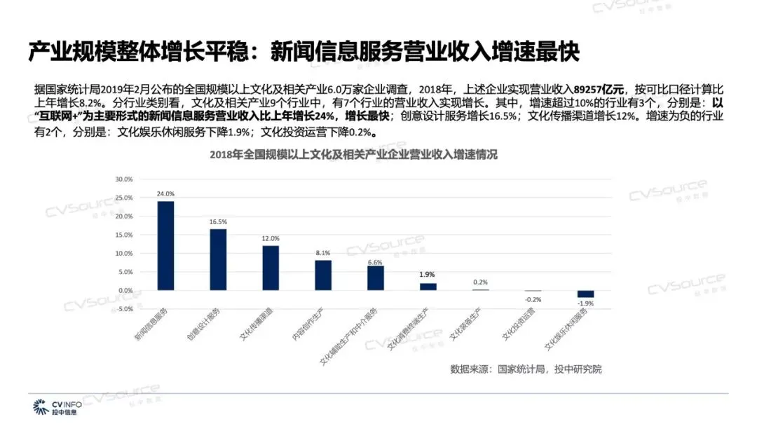 据国家统计局2019年2月公布的全国规模以上文化及相关产业6.0万家企业调查,2018年,上述企业实现营业收入89257亿元,按可比口径计算比 上年增长8.2%。分行业类别看,文化及相关产业9个行业中,有7个行业的营业收入实现增长。其中,增速超过10%的行业有3个,分别是:以 “互联网+”为主要形式的新闻信息服务营业收入比上年增长24%,增长最快;创意设计服务增长16.5%;文化传播渠道增长12%。增速为负的行业有2个,分别是:文化娱乐休闲服务下降1.9%;文化投资运营下降0.2%。