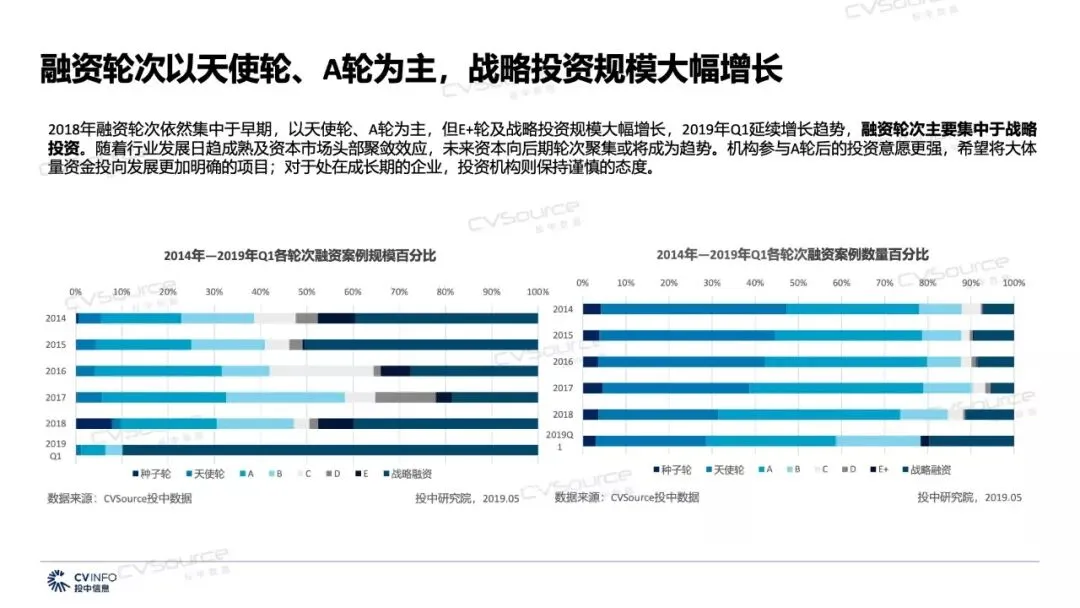 2018年融资轮次依然集中于早期,以天使轮、A轮为主,但E+轮及战略投资规模大幅增长,2019年Q1延续增长趋势,融资轮次主要集中于战略投资。随着行业发展日趋成熟及资本市场头部聚敛效应,未来资本向后期轮次聚集或将成为趋势。机构参与A轮后的投资意愿更强,希望将大体 量资金投向发展更加明确的项目;对于处在成长期的企业,投资机构则保持谨慎的态度。