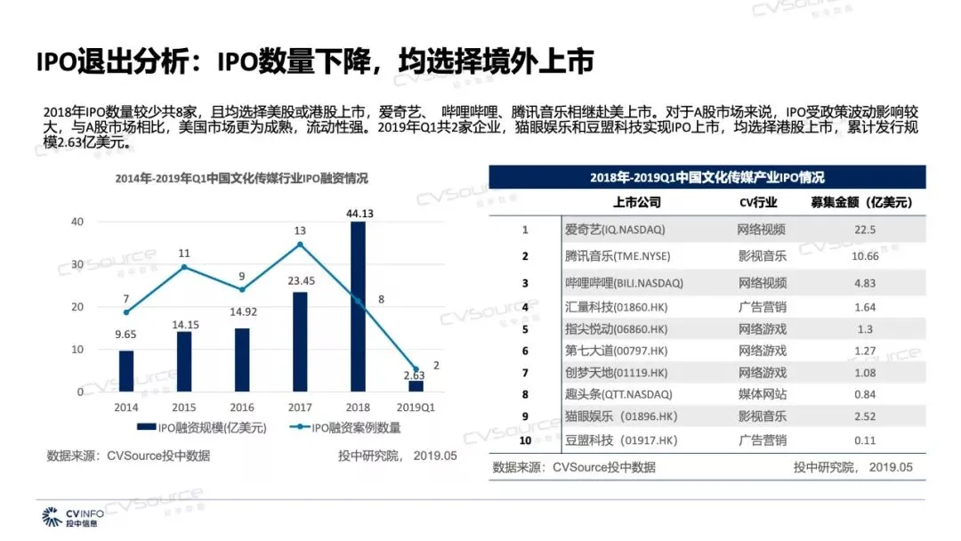 2018年IPO数量较少共8家,且均选择美股或港股上市,爱奇艺、哔哩哔哩、腾讯音乐相继赴美上市。对于A股市场来说,IPO受政策波动影响较大,与A股市场相比,美国市场更为成熟,流动性强。2019年Q1共2家企业,猫眼娱乐和豆盟科技实现IPO上市,均选择港股上市,累计发行规模2.63亿美元。