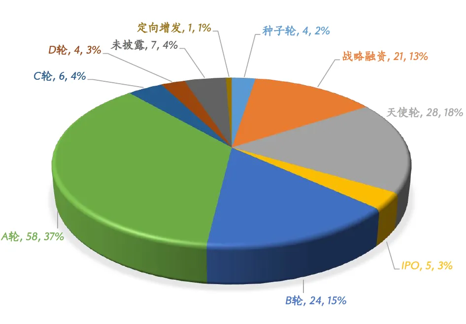 目前主要还是以天使轮、A轮(含PreA轮,A+轮)为主,合计占比55%,与2021年基本相同。另外本年战略融资数量占比达到13%。