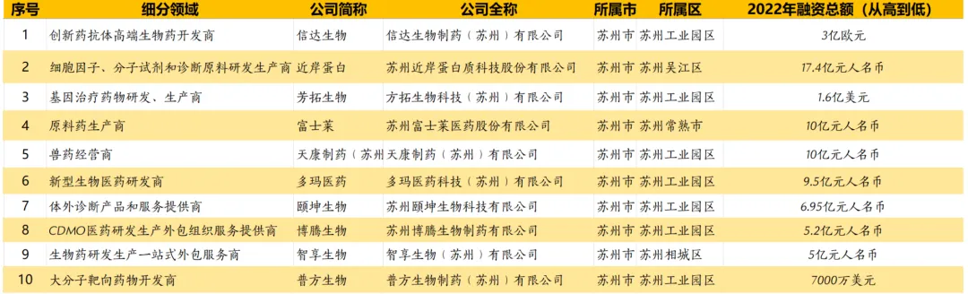 其中,融资金额合计最高的十家公司分别是:信达生物,近岸蛋白,方拓生物,富士莱,天康制药(苏州),多玛医药,颐坤生物,博腾生物,智享生物,普方生物(部分排名不分先后),十家公司融资总金额合计约100亿元人民币。