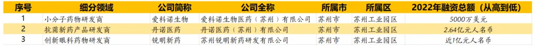 小分子研发排名前三的公司分别是爱科诺生物、丹诺医药和锐明新药。三者融资额合计约7亿元人民币。