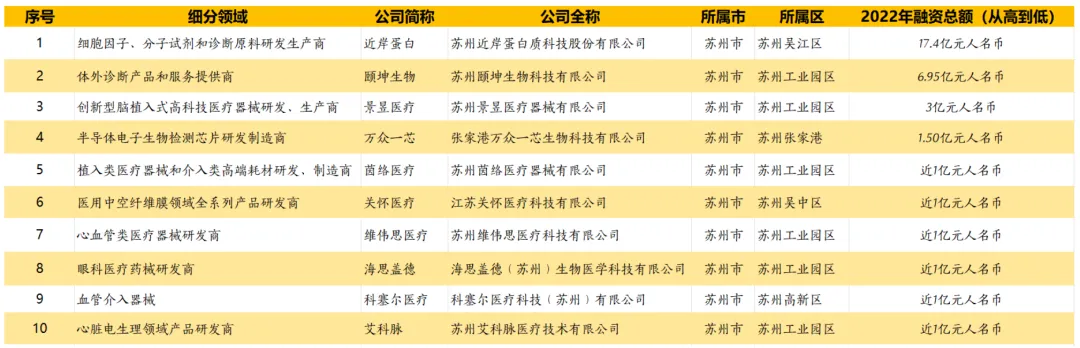 在医疗器械体外诊断领域,融资额合计排名前十的公司分别是近岸蛋白,颐坤生物,景昱医疗,万众一芯,茵络医疗,关怀医疗,维伟思医疗,海思盖德,科塞尔医疗,艾科脉(部分排名不分先后)。