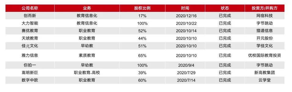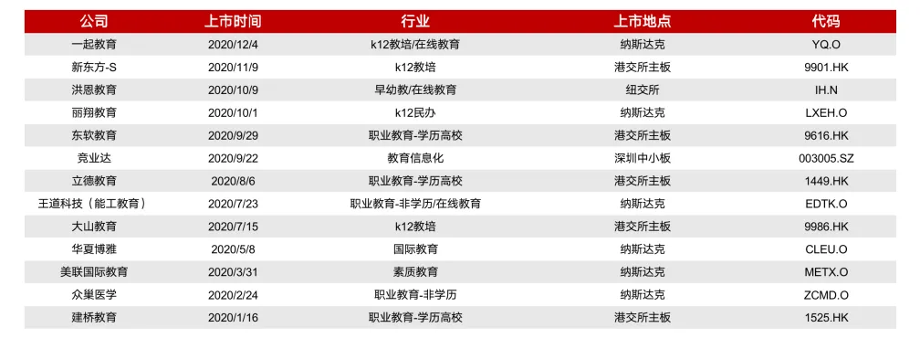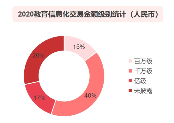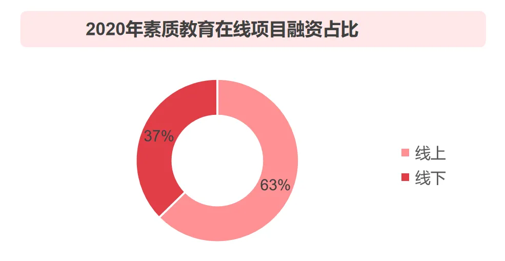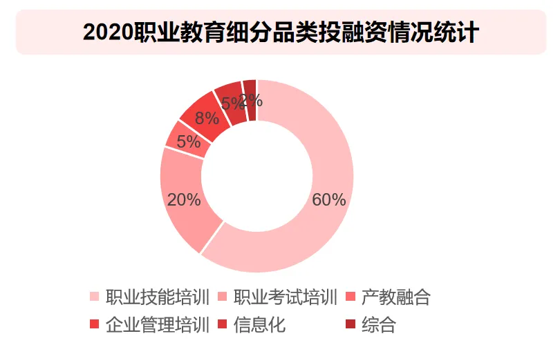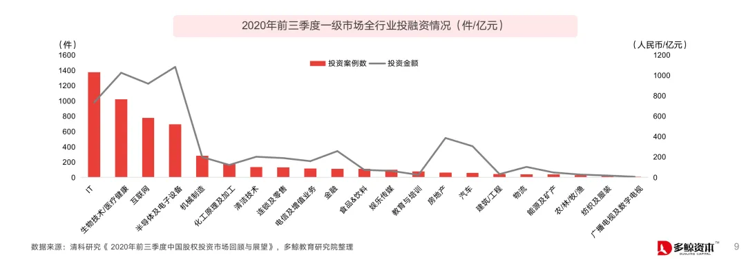 2020 政策频出之年,推进职业教育、教育信息化发展1 月,教育部《中国高考评价体系》 | 立德树人,素质教育教育功能上,实现高考由单纯的考试评价向立德树人重要载体和素质教育关键环节的转变。2 月,教育部 中小学“停课不停学”| “停课不停学”“停课不停学”要坚持把做好疫情防控工作放在首位,维护广大师生健康安全,坚决防止疫情向校园蔓延。延期开学期间开通国家中小学网络云平台和电视空中课堂,免费提供有关学习资源。3 月,教育部《关于加强“三个课堂”应用的指导意见》| “三个课堂”加强统筹规划和落地实施,指导各地推进“专递课堂”,“名师课堂”和“名校网络课堂”应用;要求到 2022 年,全面实现“三个课堂”,推动实现教育优质均衡发展。3 月,国务院《关于应对新冠肺炎疫情影响强化稳就业举措的实施意见》| “稳就业”提出 5 个方面政策措施,强调要加快恢复和做好稳定就业工作。人社部、教育部等 7 部门部署实施部分职业资格“先上岗、再考证”阶段性措施。5 月,国务院 《政府工作报告》 | “长技能、好就业”今明两年职业技能培训 3500 万人次以上,高职院校扩招 200 万人,要使更多劳动者长技能、好就业。6 月,教育部等八部门《教育部等八部门关于加快和扩大新时代教育对外开放的意见》 | “中外合作办学”破除体制机制障碍,加大中外合作办学改革力度,改进高校境外办学,改革学校外事审批政策,持续推进涉及出国留学人员、来华留学生、外国专家和外籍教师的改革,着力推进相关领域法律制度更加成熟定型,打造 “一带一路”教育行动升级版。9 月,教育部等八部门《教育部等八部门关于进一步激发中小学办学活力的若干意见》 | “办学自主”教育部切实落实中小学办学主体地位,加快推进现代学校制度建设,为保障中小学教育教学自主权、扩大人事工作自主权、落实经费使用自主权提供了有力政策保障,促进了改革与发展的深度融合、高效联动,为全面激发中小学办学活力创设了良好制度环境。9 月,教育部等五部门《关于进一步加强和规范教育收费管理的意见》| “加强收费管理” 进一步加强和规范教育收费管理,要坚持公益属性、分类管理,坚持分级审批、属地管理,坚持问题导向、改革创新的基本原则,完善教育收费政策,健全教育收费管理制度,加强教育收费治理。加大治理力度,严肃查处损害群众利益的教育乱收费行为。9 月,教育部等九部门《职业教育提质培优行动计划(2020—2023 年) 》| “提质培优”巩固职业教育产教融合、校企合作的办学模式:深化职业教育供给侧结构性改革;深化校企合作协同育人模式改革;完善校企合作激励约束机制。10 月,中共中央国务院《深化新时代教育评价改革总体方案》| “评价体系”完善立德树人体制机制,扭转不科学的教育评价导向,坚决克服唯分数、唯升学、唯文凭、唯论文、唯帽子的顽瘴痼疾,提高教育治理能力和水平,加快推进教育现代化、建设教育强国、办好人民满意的教育。10 月,中共中央国务院《关于全面加强和改进新时代学校体育、美育工作的意见》 | “体育、美育”全面实施中小学生艺术素质测评,将测评结果纳入初、高中学生综合素质评价。11 月,中共中央《中共中央关于制定国民经济和社会发展第十四个五年规划和二〇三五年远景目标的建议》 | “高质量教育体系”根据清科研究,截至 2020 年 Q3,一级市场投融资事件及融资额排名前四的行业分别为 IT、医疗健康、互联网及半导体/电子设备。其中,IT 业融资事件达到 1375 起,融资金额超过 734 亿元;医疗健康行业投融资数量达到 1020 起,融资金额 1026 亿元。根据清科研究,2020 年 Q3 教育行业股权投融资数量位列全行业 13 名;融资金额位列全行业第 19。在不考虑非公开投融资项目的情况下,仅从上述数据来看,教育行业全年依然受到股权投资市场的关注,投资金额整体较小反映估值层面更理性。数据来源:清科研究《2020 年前三季度中国股权投资市场回顾与展望》,多鲸教育研究院整理一级市场对教育行业投资持续下降。受 2018 年中期以来金融市场去杠杆和实体经济持续不景气的影响,教育行业一级股权市场的募投进入下行区间,市场不景气很明显地反映在投融资数据上。另一方面,赛道政策愈发趋严,市场担忧投资风险,导致赛道的投融资数量减少。根据多鲸教育研究院整理的市场公开数据,一级市场投融资事件数量已连续四年下跌, 2020 年教育行业一级市场投融资数量为 257 起(不含上市公司 IPO 和并购),同比下降近 17%,为近五年新低。素质教育、教育信息化、职业教育、K12 教育投融资数量排名前四。从细分品类来看,素质教育投融资数量多达 76 起(占比 30%),教育信息化紧随其后,投融资数量达 67 起,这两个赛道的投融资数量远超其他赛道。注:细分赛道融资事件互有交叉,即一家公司可能分属多个赛道根据公开数据统计,2020 年教育行业投融资依然多发生在早期阶段,其中 A 轮及以前投融资数量为 175 起(占比 68%),主要原因在于今年占比最大的素质教育赛道融资项目多为早期;B 轮至 E 轮融资数量为 72 起(占比 28%),且以 K12 赛道和教育信息化赛道项目为主。整体而言,教育行业单笔融资金额逐渐增长。从融资金额来看,2020 年千万级人民币融资 71 起(占比 50%);亿元及以上人民币融资项目 41 起(占比 28%)