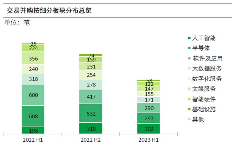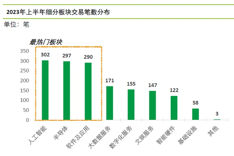 结合趋势看,受宏观环境影响,TMT行业投资放缓,交易数量持续下降:半导体和软件应用热度褪去,但人工智能板块逆势崛起;交易轮次来看,市场对早期标的表现出审慎态度,但对优质资产的战略投资/并购有所攀升。