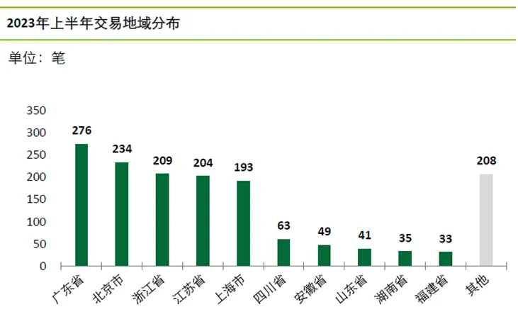 2023年上半年TMT行业投融资以人工智能、半导体和应用开发为最热门的赛道;从地域看,以广东、北京和长三角为代表的发达省市仍旧是TMT投融资的活跃地区。