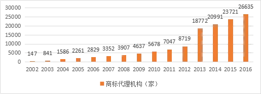 [4]中国发展网,《截止2016年底我国商标代理机构总数为26635家》,http://www.chinadevelopment.com.cn/news/zj/2017/01/1118682.shtml,访问日期2017-3-17