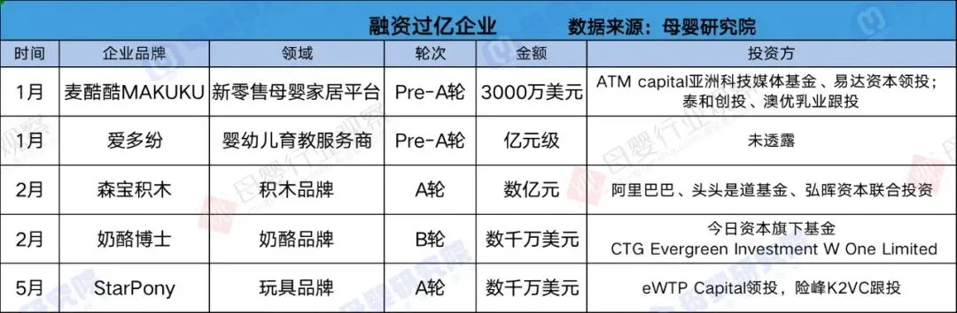 具体来看,婴童食品融资集中在辅零食和乳制品相关领域,有三点变化值得关注:其一,优质项目持续获得资本青睐,加速品牌发展,如奶酪博士、简爱酸奶、窝小芽再次拿到新一轮融资;其二,辅零食红海竞争中仍然有赛道新星突出重围,儿童健康鲜食「唯鲜良品」、儿童零食「妈咪呀」、儿童健康餐食「怡芽YUMMYKIDS」、常温奶酪食品生产商「优鲜工坊」获得天使轮融资,值得一提的是,近日母婴行业观察独家消息获知,国产辅食领先品牌英氏获得南京星纳亦企业管理合伙企业、厚元资本、嘉御基金等投资,投资金额未披露,工商信息显示,南京星纳亦企业管理合伙企业背后关联五星控股集团有限公司,五星控股法定代表人汪建国正是孩子王创始人。其三,特医食品进入资本视野,特殊医学用途配方食品研发与生产商「科露宝」获数千万元融资,据品牌方介绍,科露宝多个婴幼儿特医食品现已获得市场监督管理总局注册受理。此外,玩具市场品牌化、IP化、益智化趋势明朗,森宝积木品牌与IP双轮驱动,A轮融资由阿里巴巴参投;加之去年拿到6亿融资的布鲁可,国产积木正在迎来春天。推车、安全座椅等婴童出行品类呈现新的发展趋势,材质、设计等多维度升级,产品功能多样化、智能化、操作更方便,创立于2019年的两只兔子从安全座椅切入,逐步推出婴儿推车、餐椅,向全品类出发,今年3月完成天使轮融资。婴童洗护产品功能向更细密和精准的方向发展,市场集中度偏低,外资本土竞争激烈,新品牌仍有很大的机会,主打3-12岁儿童个护的新晋品牌海龟爸爸上半年拿到近亿元融资。童装新质感、新材料、新款式加速创新,TOP FAVOR成立三个月完成两轮融资,主打AI设计、AI营销、AI供应链和AI柔性智造,探索人工智能对服饰产业的变革,据悉第三轮融资也在进行当中。整体来看,成熟品类聚焦品质革命,用户需求升级倒逼产业在产品专业度、体验感等维度创新升级,同时,母婴消费个性化、高端化趋势下,许多非刚性需求逐渐成为必需品。深入挖掘用户需求变化以及细分品类趋势,同时在渠道布局、营销打法等维度持续迭代,占领用户心智,将成为品牌突围的关键。《报告》显示,母婴服务领域上半年有7起融资事件,主要聚焦产康护理、托育、亲子陪伴等。其中融资金额最大的一笔来自婴幼儿托育服务商「爱多纷」,针对如何从零开始建立托育服务机构、开园后的运营过程中遇到效益不佳招生难等托育服务从业者需要解决的几大难点,「爱多纷」通过各端提供线上线下的智能化解决方案。