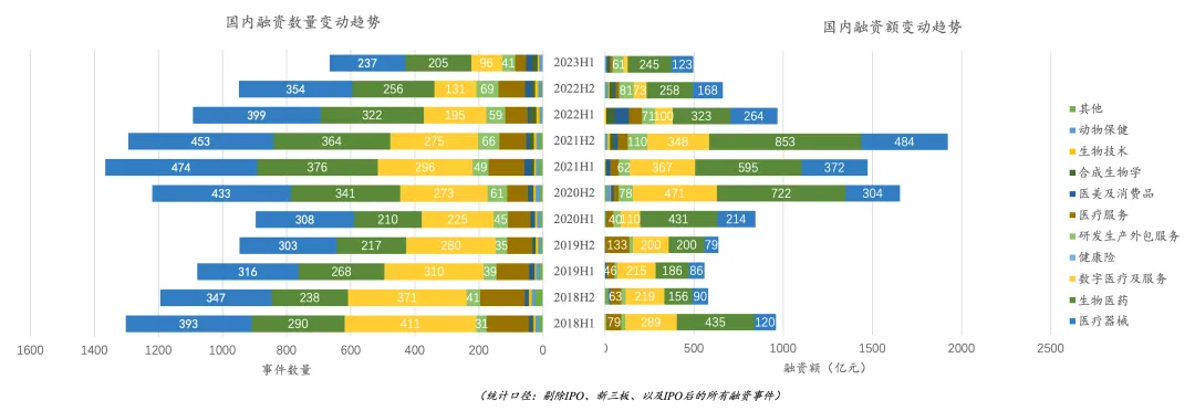 •2023 H1 国内一级市场融资数量为 666 起,主要为医疗器械(237 起,36%),生物医药(205 起,31%)和数字医疗与服务(96 起,14%)。环比下降 30%,同比下降 39%,整体趋势仍在下滑。