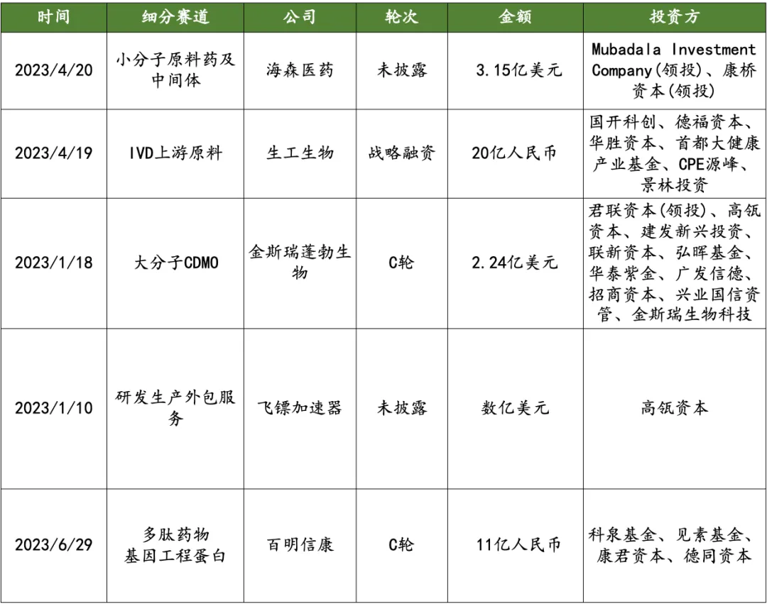 •专用耗材领域主要涉及牛血清、色谱填料、分离纯化设备和检验耗材,投融资事件大部分为 A/B 轮。例如 2023 H1 连续完成两轮近亿元融资的牛血清企业依科赛生物。