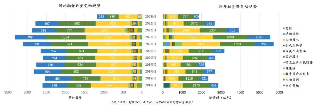 2023 H1 国外一级市场融资额为 1881 亿元,其中主要细分赛道为生物医药(794 亿元,42%),数字医疗(541 亿元,29%)和医疗器械(305 亿元,16%)。环比下降 30%,同比下降 52%。