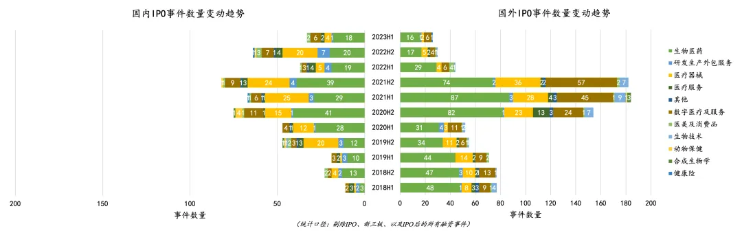 •医疗器械和研发生产外包数量下降较为明显,分别为 80% 和 85.7%,没有出现部分赛道 IPO 事件数量上涨的情况。