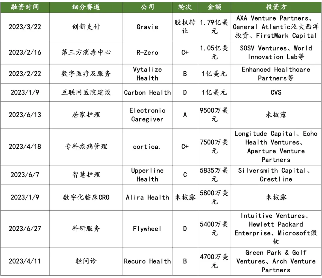 数字医疗及服务:2023 H1 全球数字医疗及服务投融资主要发生在国外,热点主要集中在轻问诊、AI 辅助诊断、检验中心、互联网医院建设和医药电商。