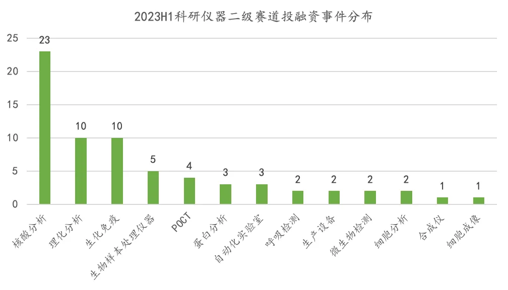 •2023 H1 科研仪器赛道投融资热点主要集中在核酸分析、理化分析和生化免疫。