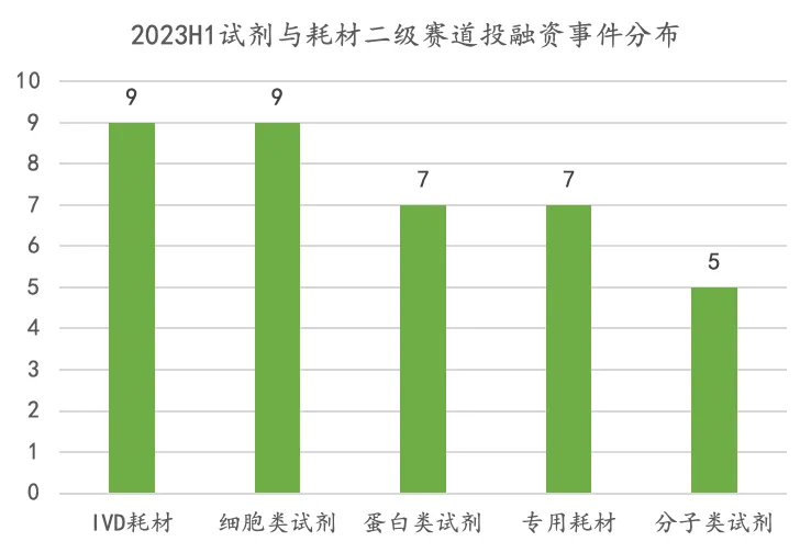 •由于2022H2近一半融资事件未披露金额,因此 2022 H2 融资额较小。相比 2022 H2,2023 H1 试剂与耗材融资额提升幅度大;相比 2022 H1,试剂与耗材融资额增长 1.5 倍。