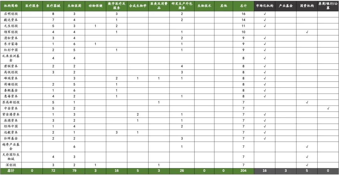 2023 H1 出手医疗领域超过出手超过七次的机构总共有 24 家,主要投往医疗器械、药赛道。其中 18 家为市场化机构。