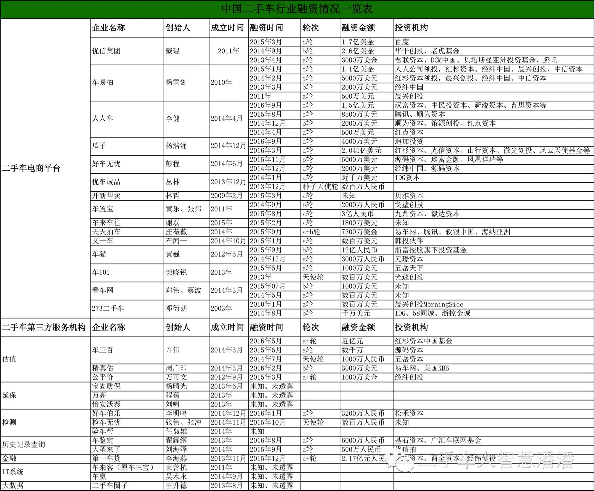 其中,获融资最多的二手车企业分别为:瓜子、优信、人人车、车易拍、车猫、天天拍车、好车无忧、车置宝、车三百等。