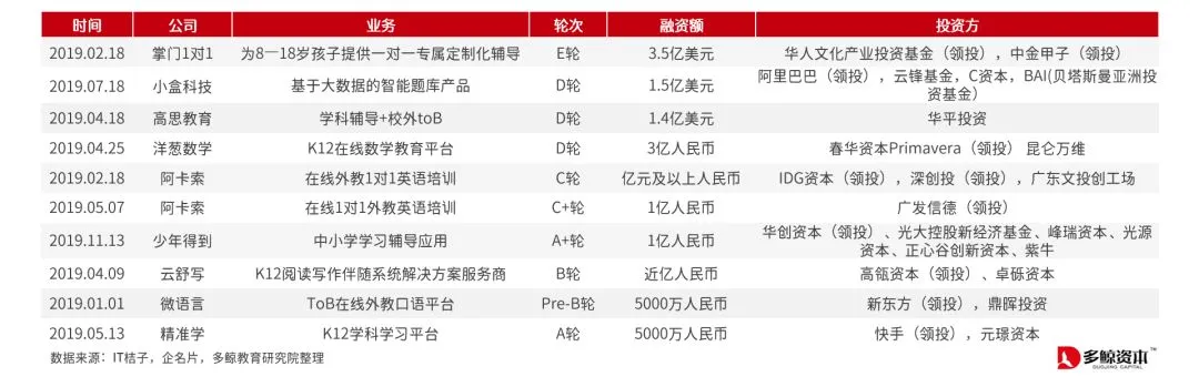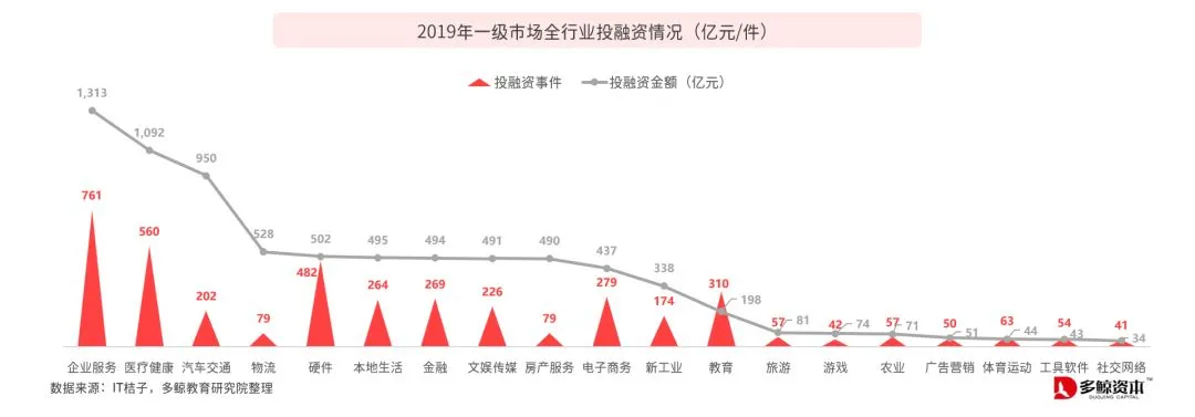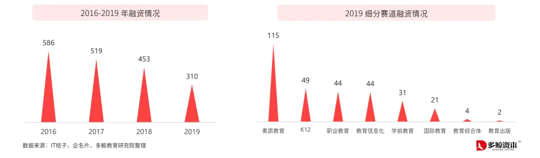 根据多鲸资本根据公开数据统计,2019年教育行业股权投融资数量达到300起以上,位列全行第4;