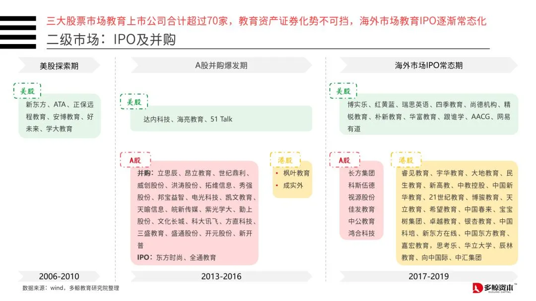 三大股票市场教育上市公司合计超过70家,教育资产证券化势不可挡,海外市场教育IPO逐渐常态化。