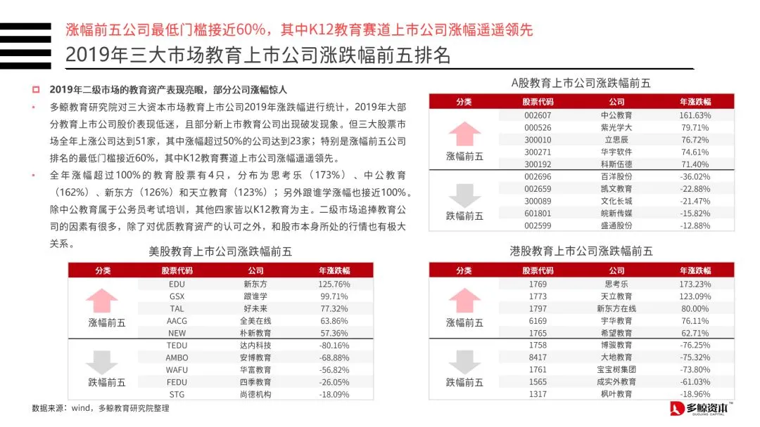 其中,三大股票市场全年上涨教育公司达超过50家,且涨幅超过50%的公司达到23家;