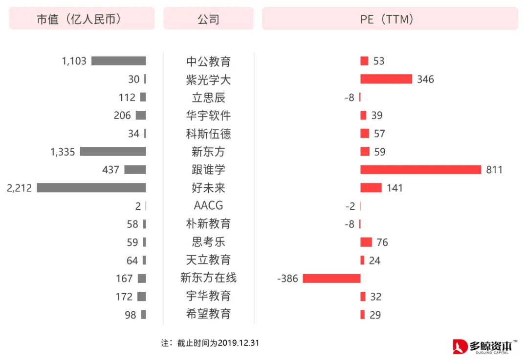 2019年有三家教育公司市值破千亿,分别是好未来、新东方和中公教育。