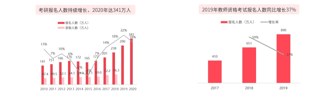 另外,考研报名人数也持续增长再创新高,2020年报考人数达341万人。