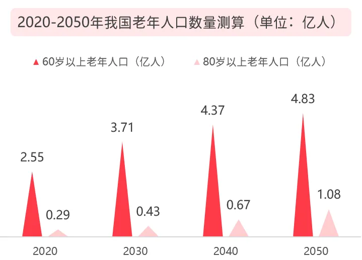 中国大健康产业发展报告》预测,2050年我国60岁及以上老年人口将达4.83亿,80岁及以上老年人口将达1.08亿。