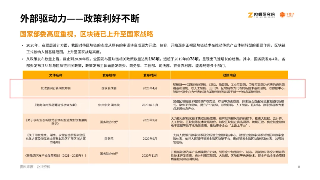 近日,中央印发《建设高标准市场体系行动方案》,提出加大新型基础设施投资力度,推动第五代移动通信、物联网、工业互联网等通信网络基础设施,人工智能、云计算、区块链等新技术基础设施,数据中心、智能计算中心等算力基础设施建设。可以看出,区块链已明确摆在了新时代下我国经济转型发展的重要地位。