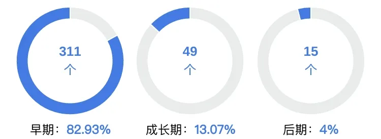 阶段分布上:早期(311个)、成长期(49个)、后期(15个)。
