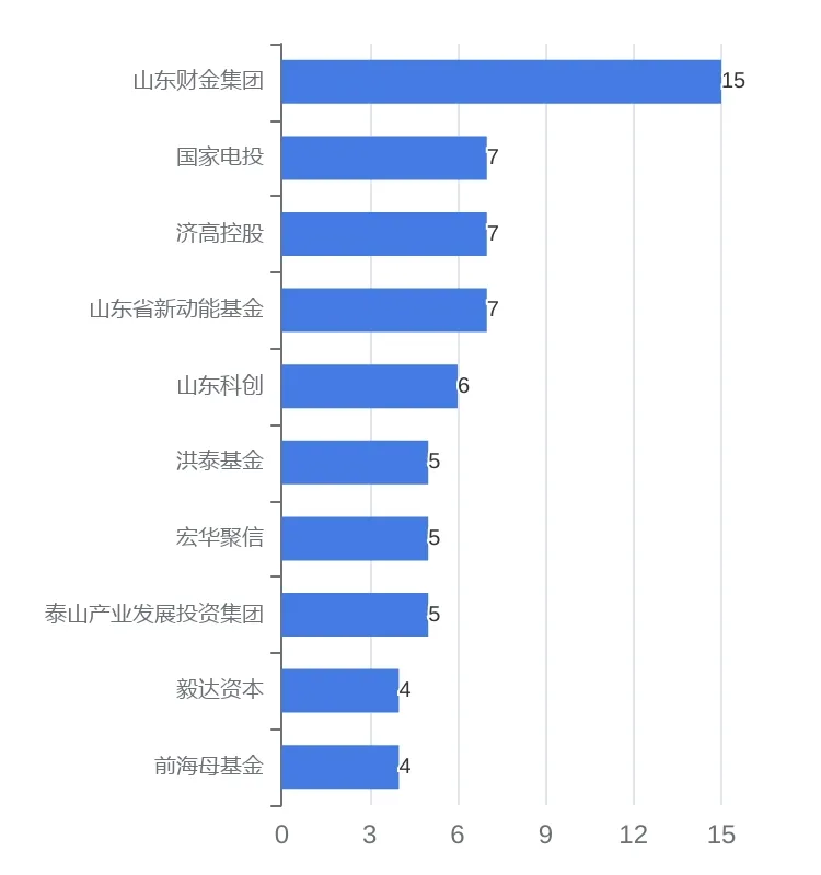 2023年,「山东省」投资活跃的机构主要为:山东财金集团(15个)、国家电投(7个)、济高控股(7个)、山东省新动能基金(7个)、山东科创(6个)。