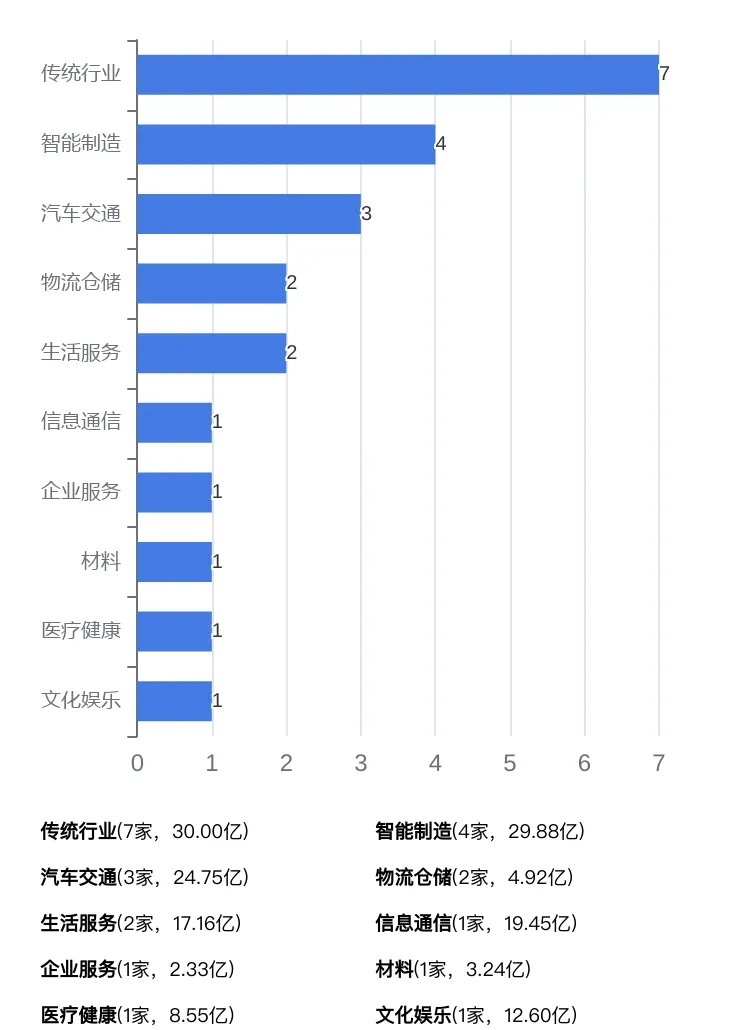 2023年完成IPO上市的企业共集中在10个行业,排名前五的行业为:传统行业(7家)、智能制造(4家)、汽车交通(3家)、物流仓储(2家)、生活服务(2家)。