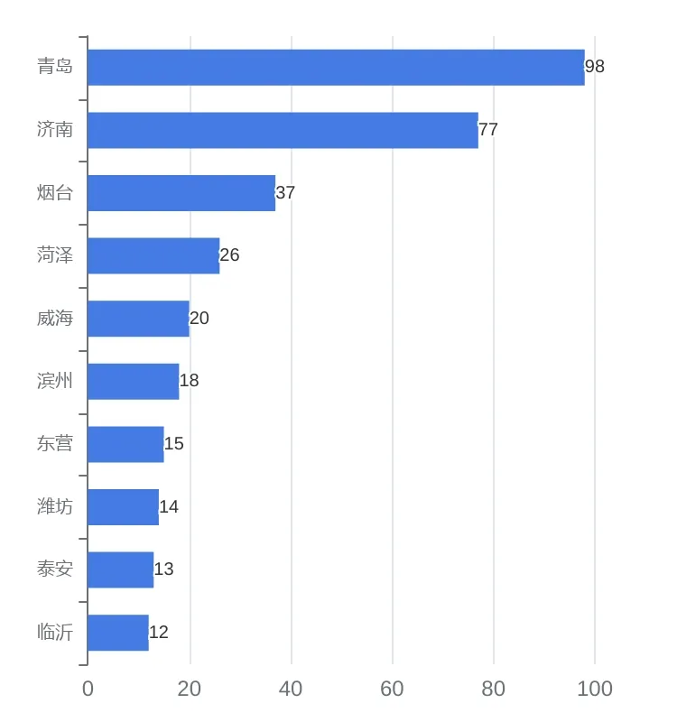 从融资事件发生的地区来看,2023年事件数量排名前五的地区为青岛(98个)、济南(77个)、烟台(37个)、菏泽(26个)、威海(20个)。