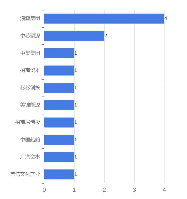 从投资事件数来看,排名前五的CVC机构为:浪潮集团(4个)、中芯聚源(2个)、中集集团(1个)、招商资本(1个)、杉杉创投(1个)。