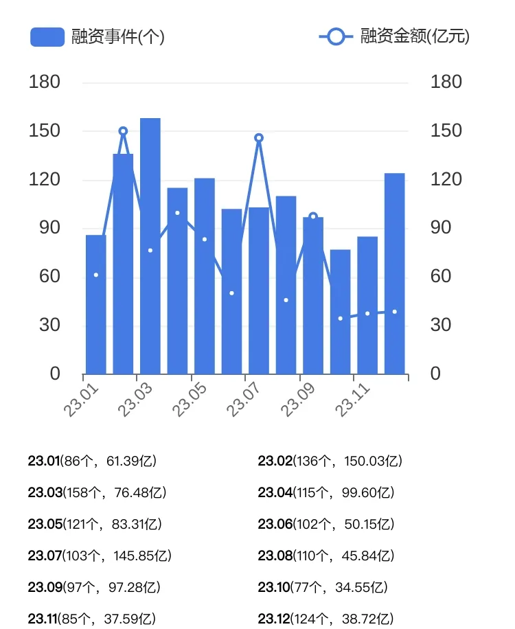 睿兽分析数据显示,2023年12月「江苏省」一级市场发生融资事件124个,比上月增加39个(