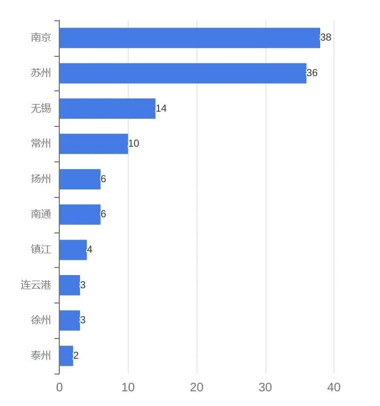 从融资事件发生的地区来看,本月事件数量排名前五的地区为南京(38个)、苏州(36个)、无锡(14个)、常州(10个)、扬州(6个)。
